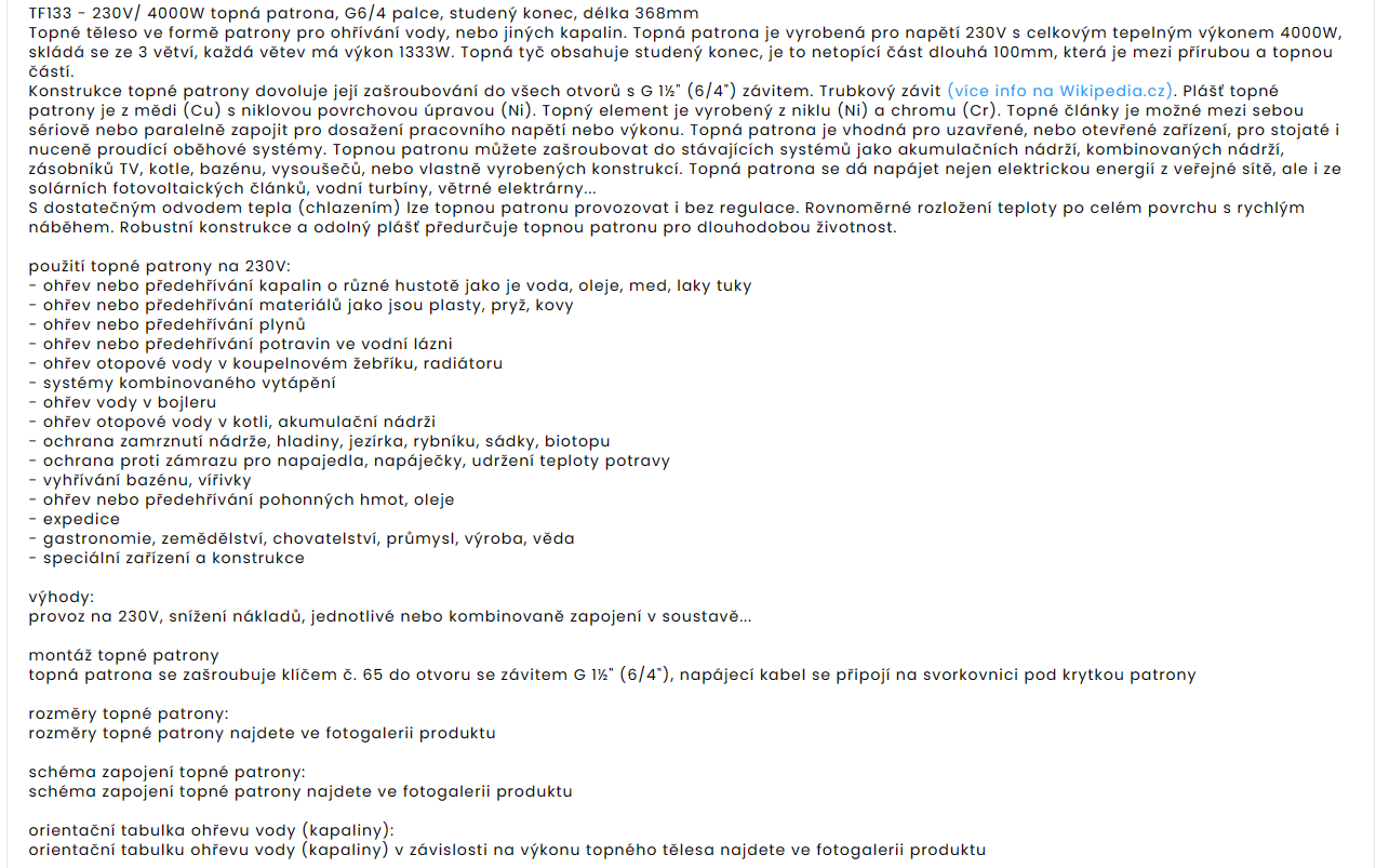 - TF133 230V/4000W topná patrona,G6/4 palce,studený konec,délka 368 mm