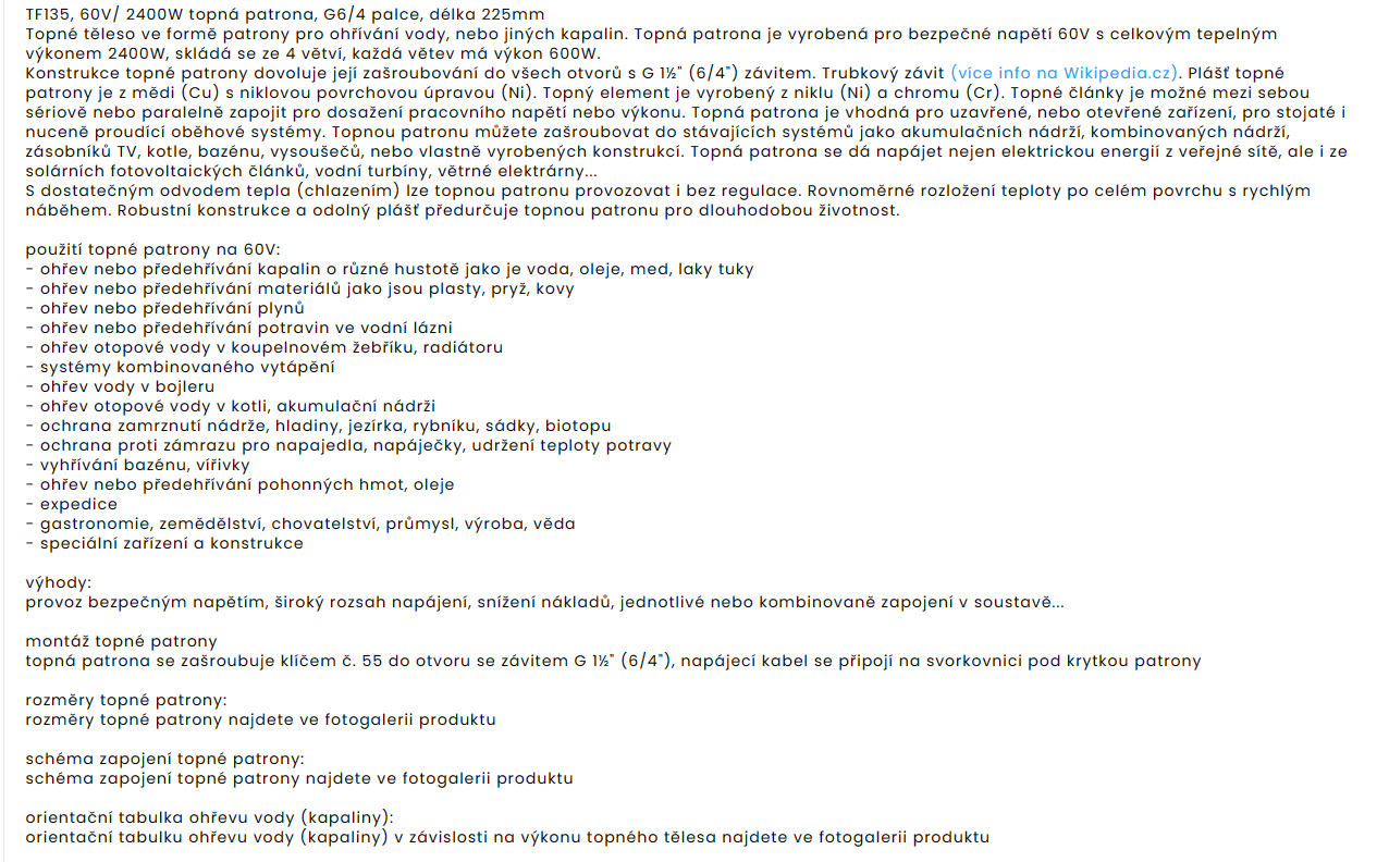 - TF135 - 60V/2400W topná patrona G6/4 palce délka 226 mm