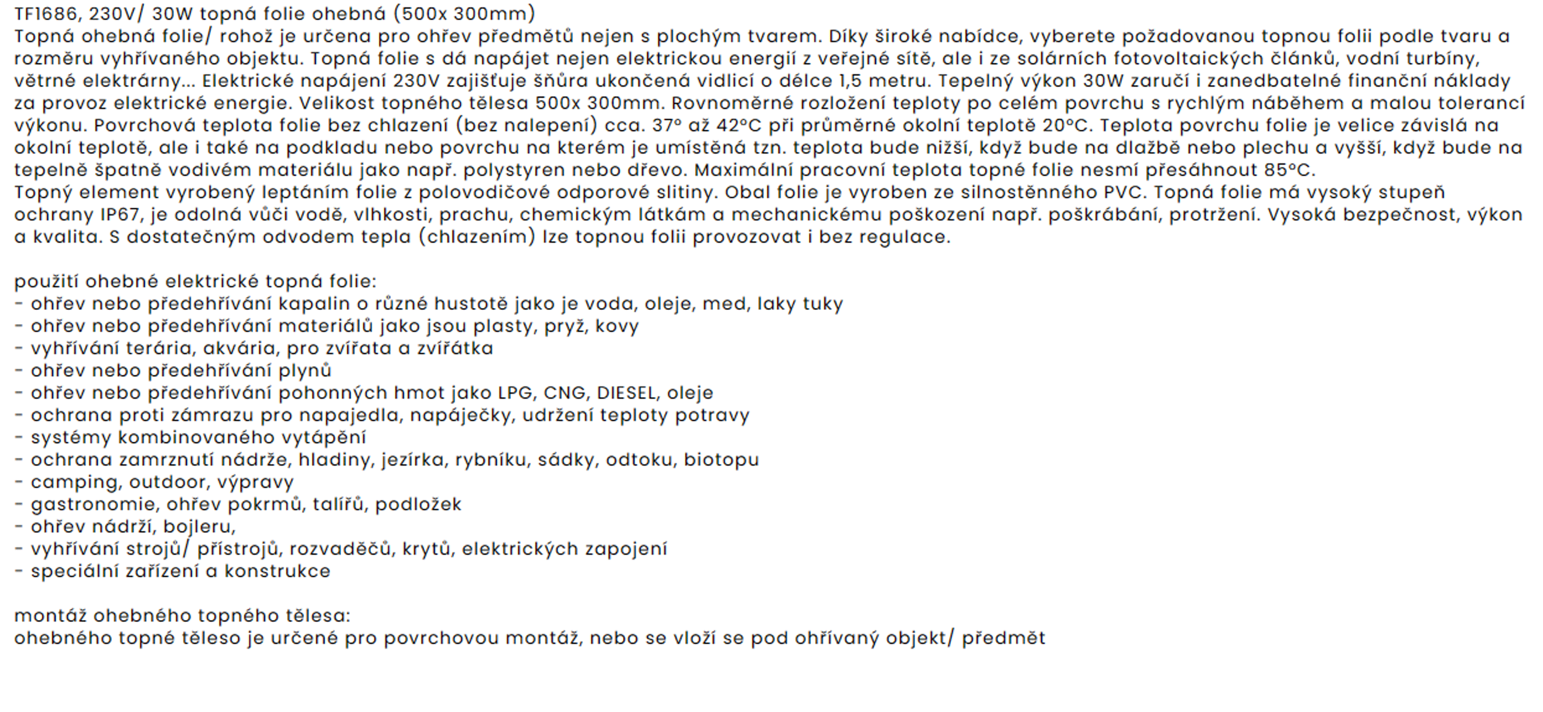 - TF1686 230V/30W topná folie ohebná 500 x 300 mm