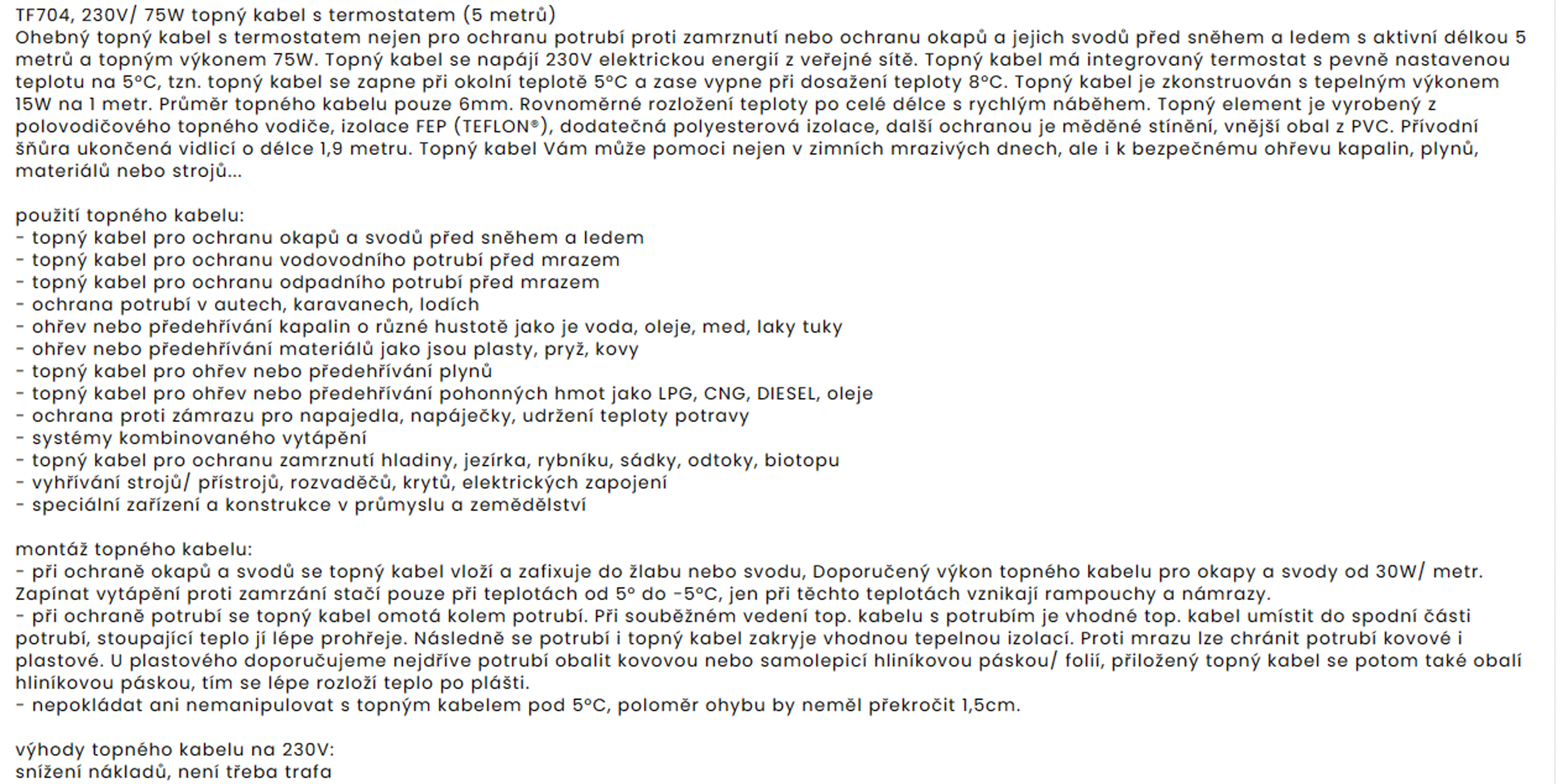 - TF704 230V/75W topný kabel s termostatem 5 m